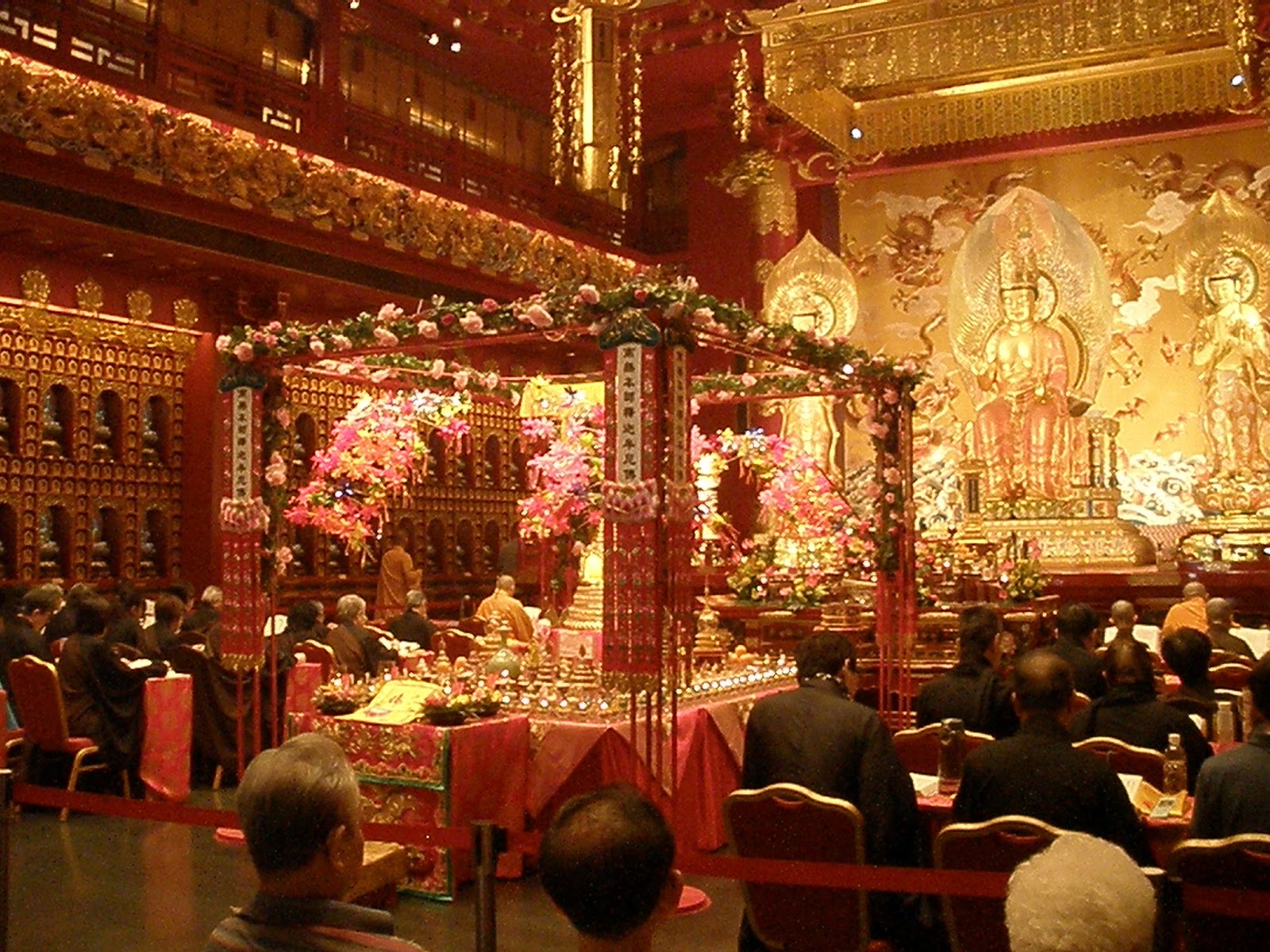 After we visited Little India, we were taken to a jewelry factory with beautiful gold and precious stone jewelry. That was the selling part of the tour. The tour operators probably got a percentage of any sales made. Luckily, they didn't spend too much time trying to sell us overpriced high end jewelry. Our next stop was in Chinatown. The culture of Singapore is influenced in moderate part by mainland China. I have to say that my favorite part of Chinatown was our visit to the Buddhist temple. We were lucky enough to be allowed in while services were taking place. I had to cover up my shoulders with a musty cape because I was wearing a sleeveless shirt. The monks were at the front of the room chanting. It's an eerie sound, all five of them chanting together in Chinese in a monotone but somehow harmonious tune. It was almost as if the sound itself was tickling the edges of heaven. The temple itself was marvelous. It was covered in images of Buddha, flowers, offerings, and shrines.
